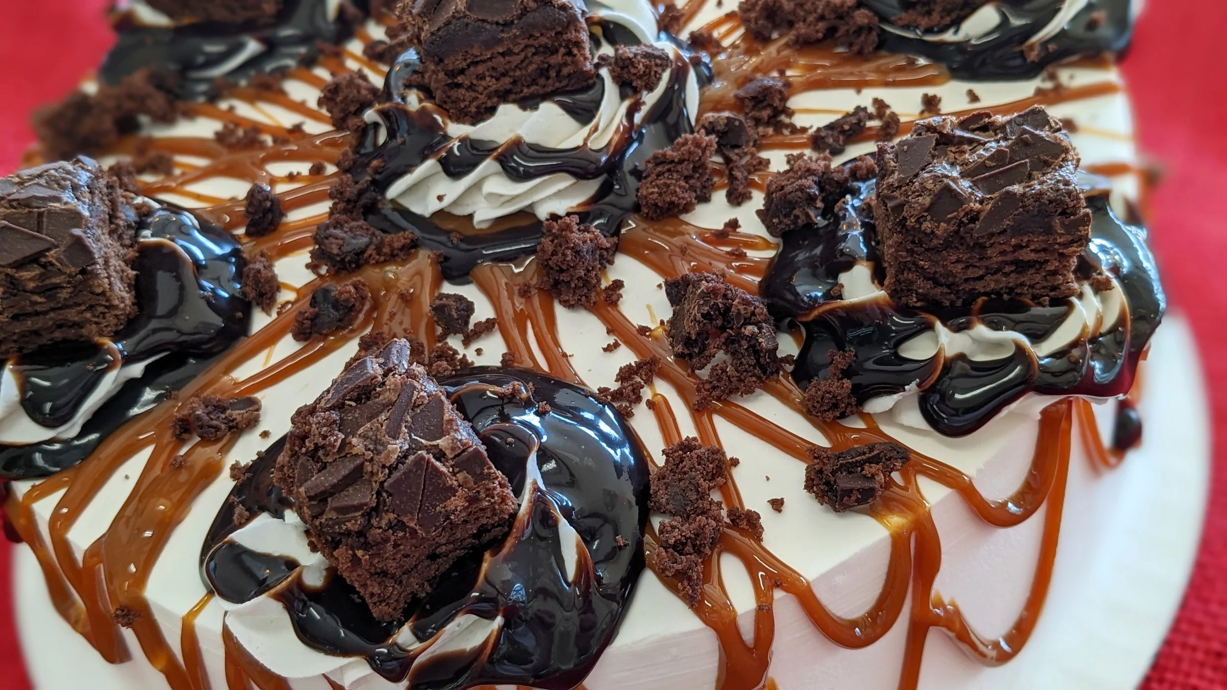 Cooke Dough Ice Cream with vanilla or chocolate frosting (depending on availability), covered in fudge, caramel and chewy baked brownie pieces. Chocolate cake base. Serves around 13.