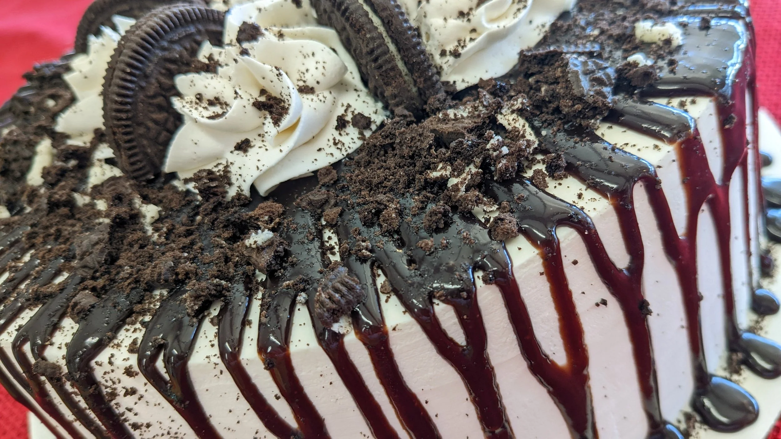 Cookies n' Cream ice cream with vanilla or chocolate frosting (depending on availability), cookie crumbs and Oreo resting atop mountains of frosting dollops. Chocolate cake base. Serves around 13.